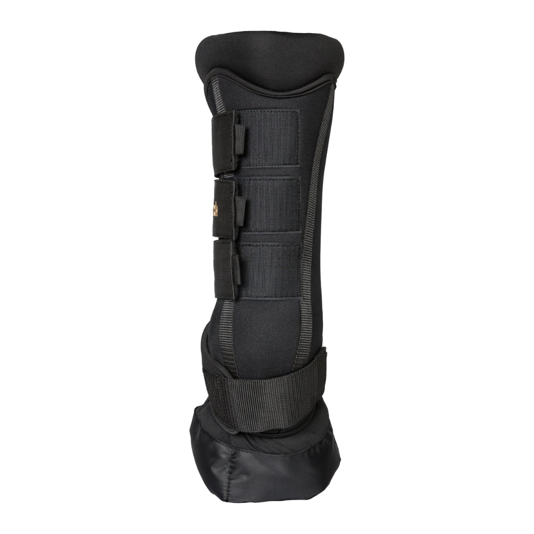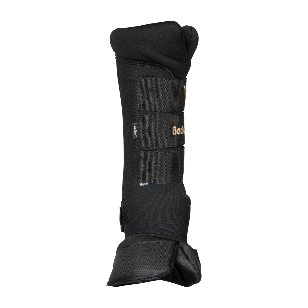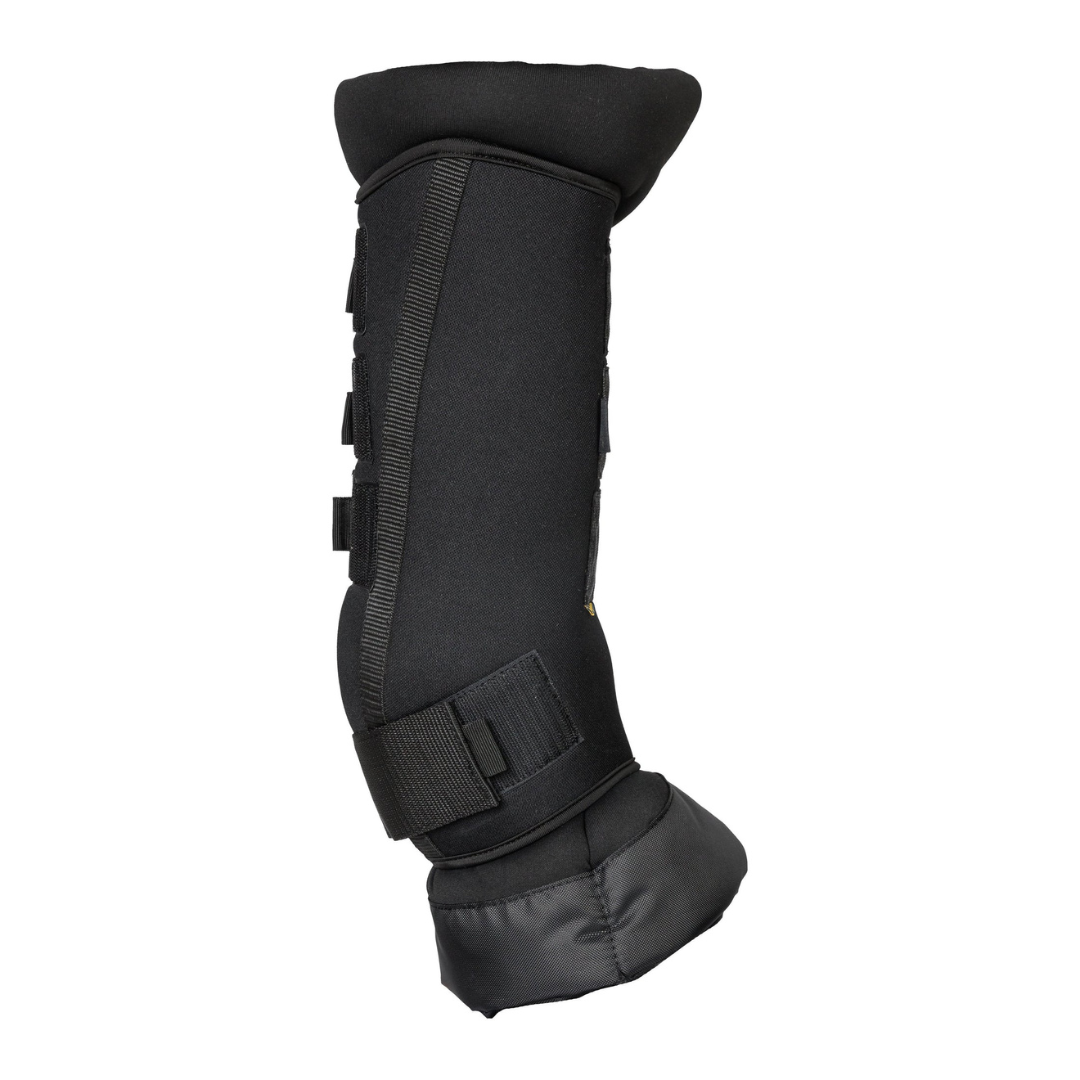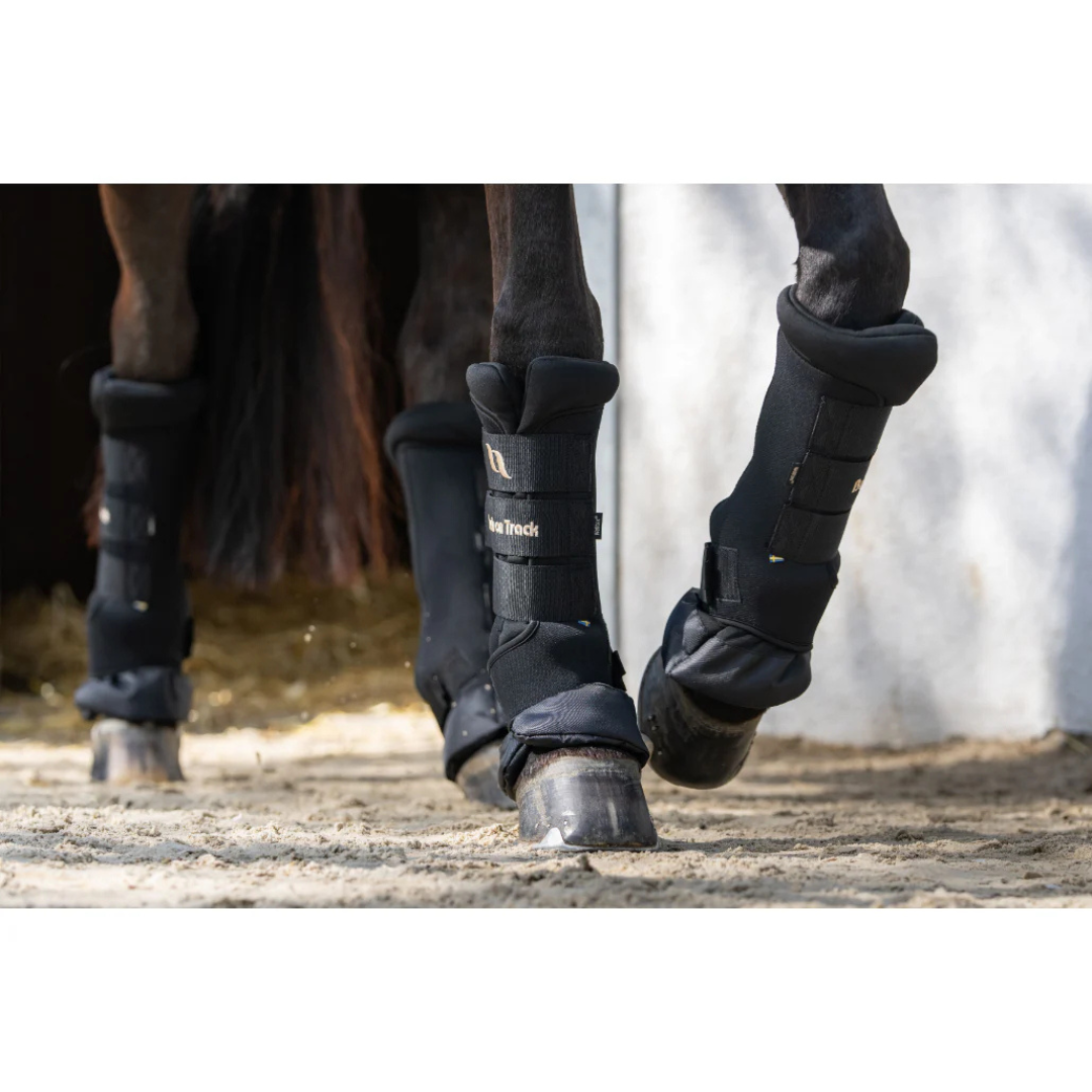 The Back on Track Therapeutic Quick Wraps are designed for injury prevention and recovery. They have ceramic particle-infused fabric which reflects the horse's body energy to create infrared waves. This improves blood circulation and alleviates pain associated with inflamed muscles, ligaments, tendons and joints. The outer is durable and hard-wearing. The inner layer is a thick inner pad with Welltex® technology and a reinforced fabric in water-repellent material at the bottom towards the hoof. The Royal Deluxe model is anatomically shaped for the best possible fit and comfort.